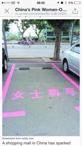 A furore has been caused in China by the creation of some pink parking spaces for women only. Not only are they pink, but they are larger than the other spaces. The implication is of course that women can’t drive and therefore need larger spaces.
